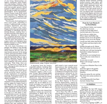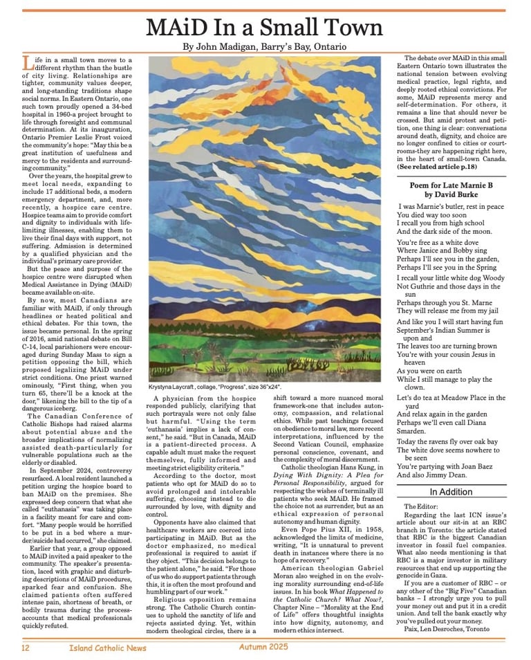 Krystyna Laycraft got the news that her collage was chosen to illustrate the article about MAiD (Medical Assistance in Dying) published in the Autumn 2025 edition of ICN (Island Catholic News).